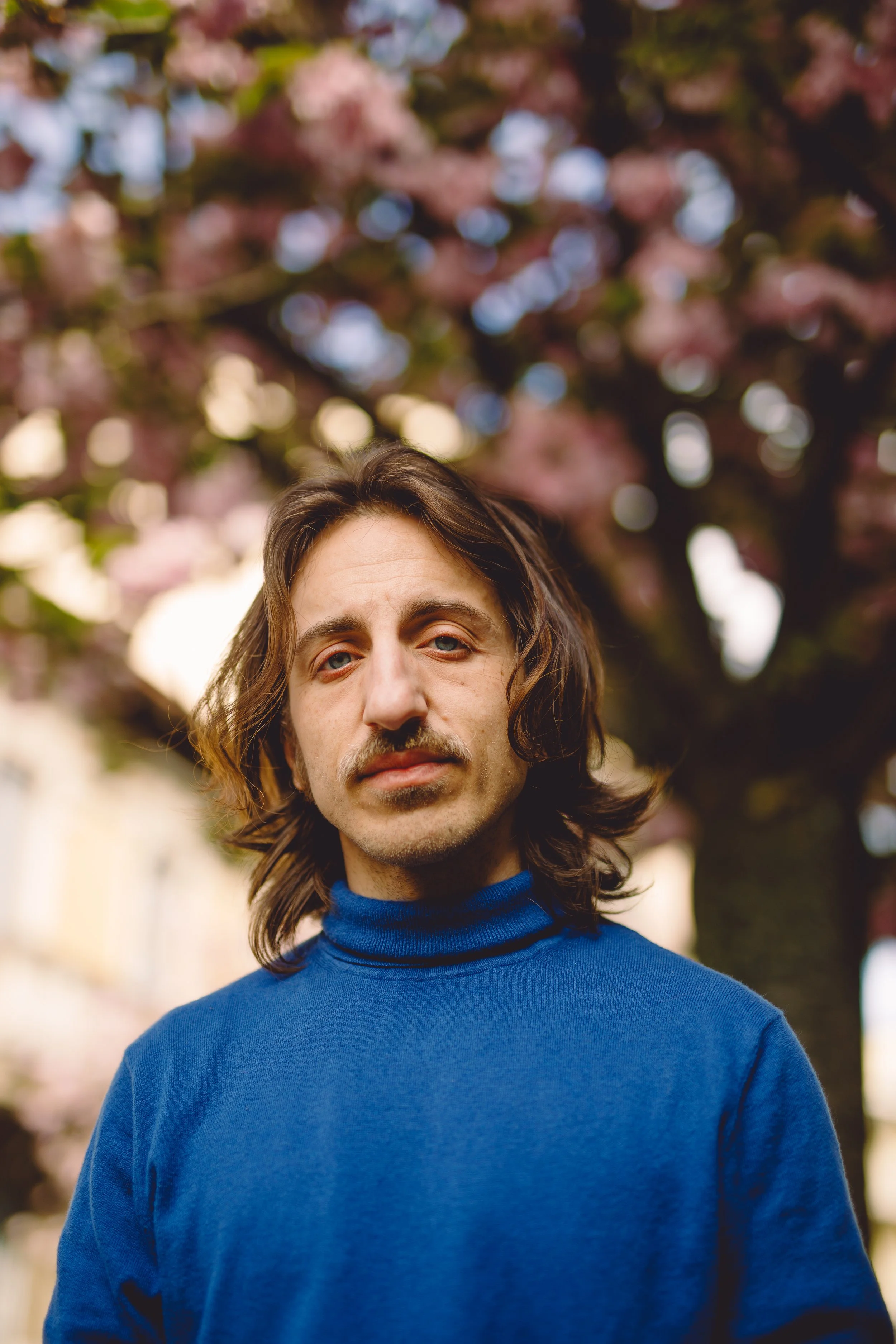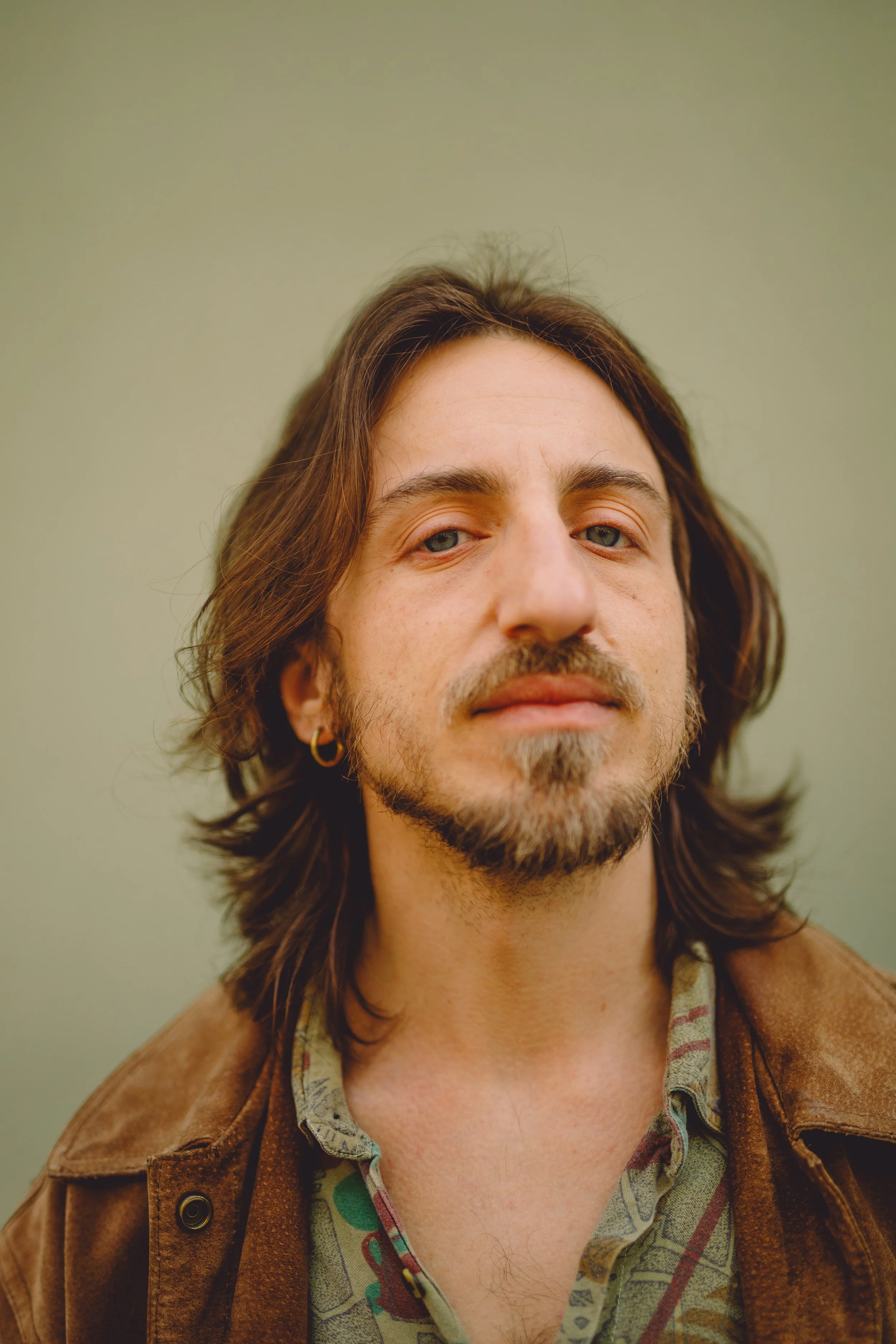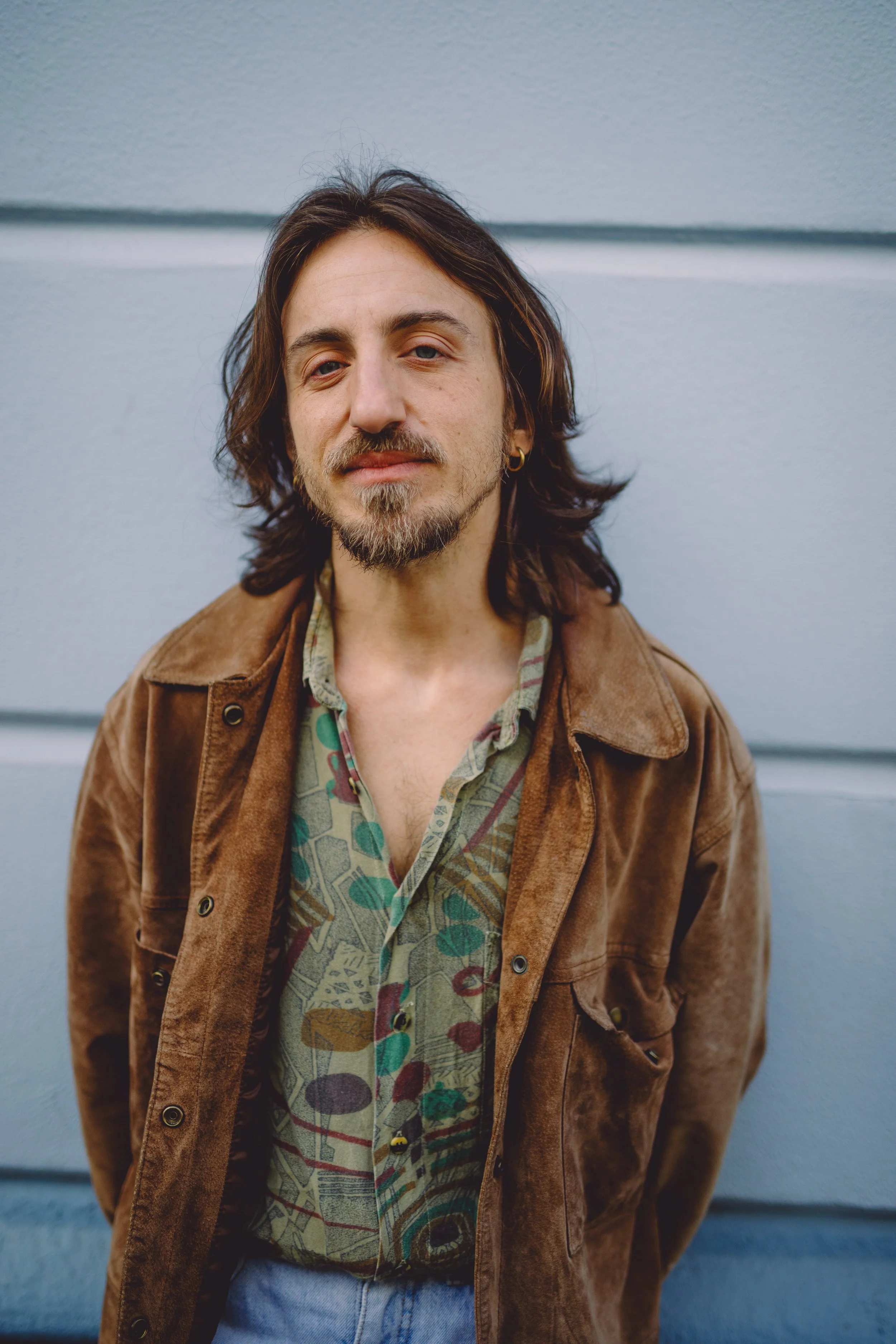 ritratto di un uomo con capelli lunghi e barba, indossa una giacca marrone e una camicia colorata, si trova davanti a una parete blu.
