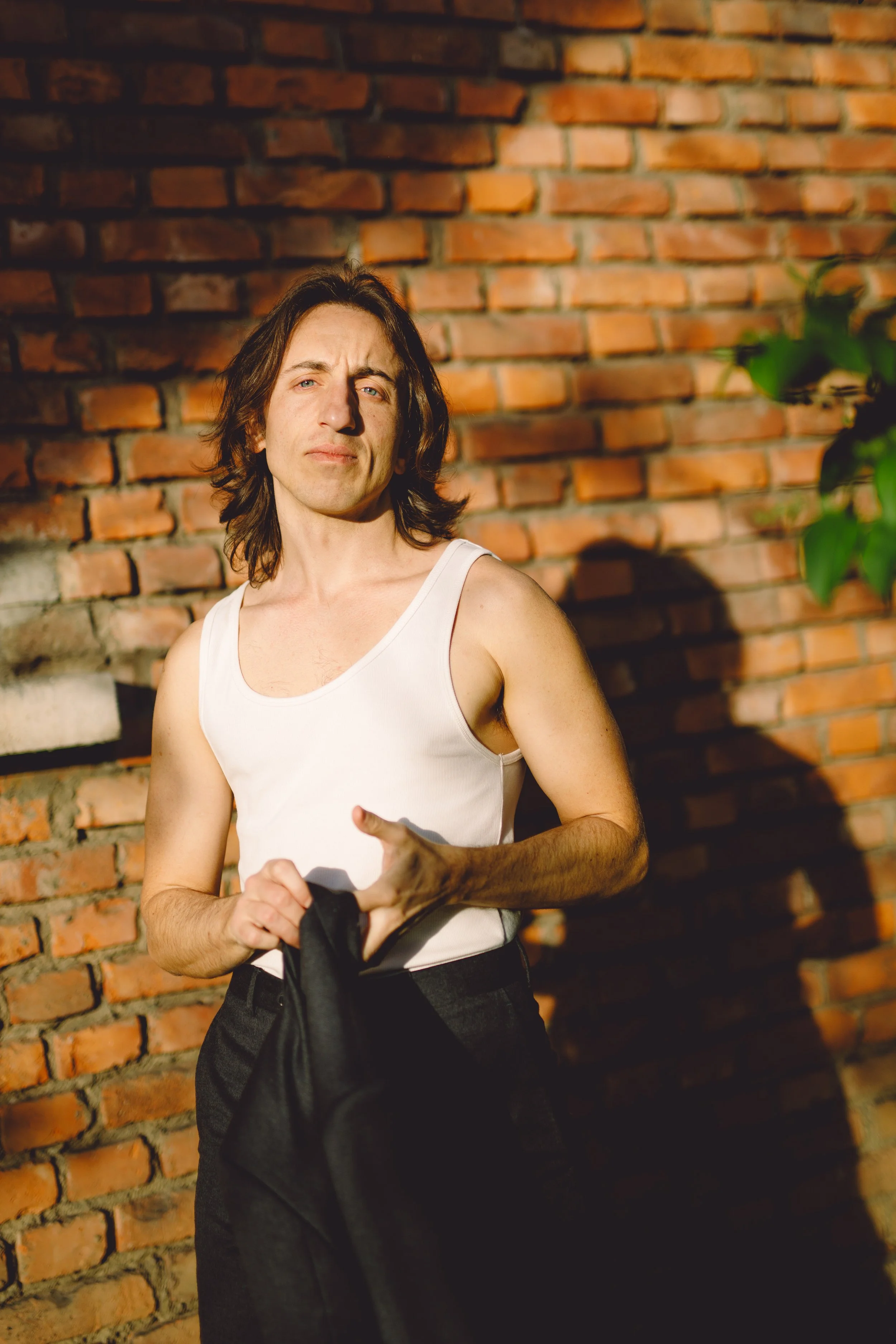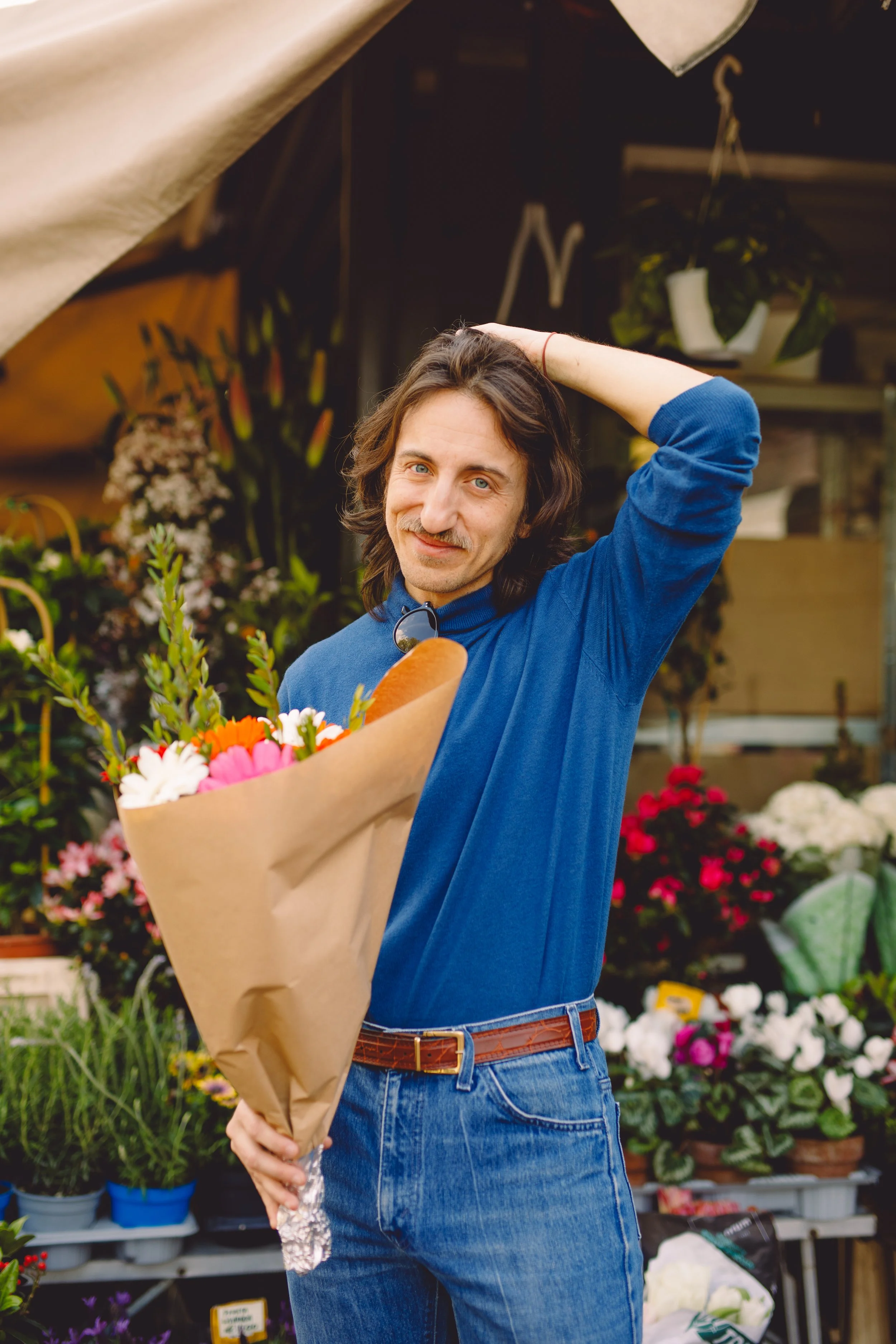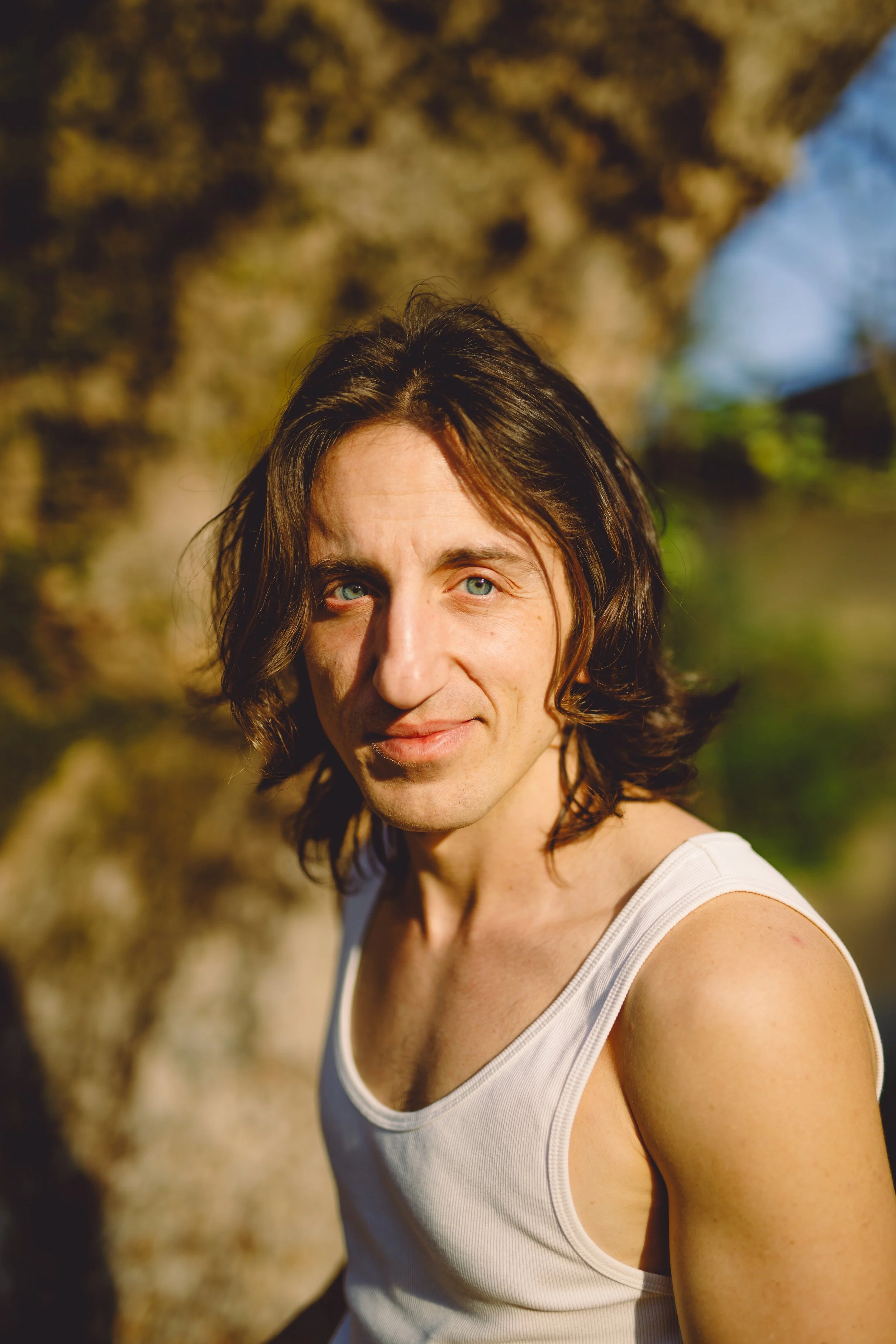 ritratto di un uomo con capelli lunghi e barba, indossa una giacca marrone e una camicia colorata, si trova davanti a una parete blu.