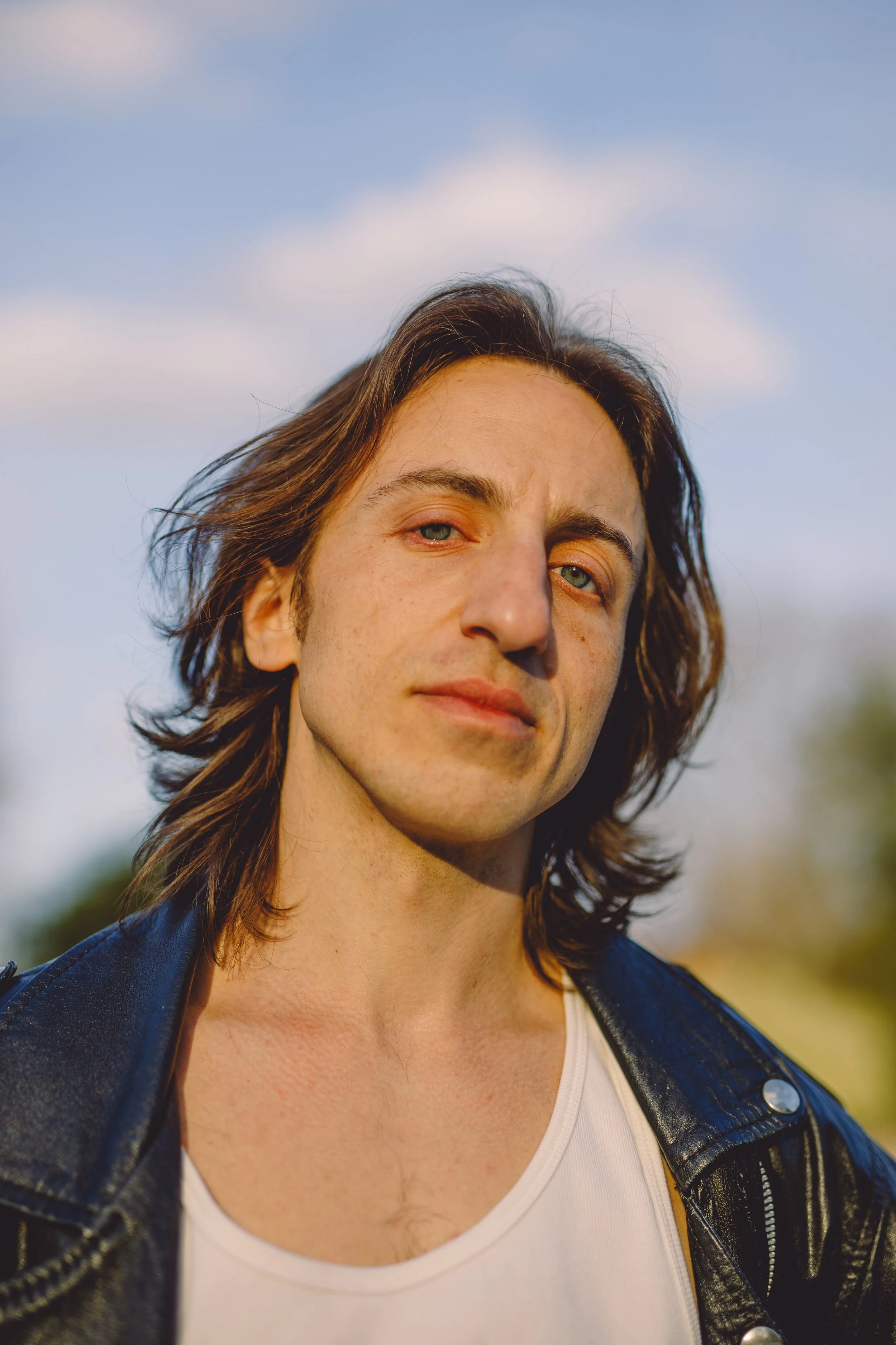 Ritratto di un uomo con capelli castani, che indossa una giacca di pelle e una maglietta bianca, con uno sfondo di cielo blu e nuvole.