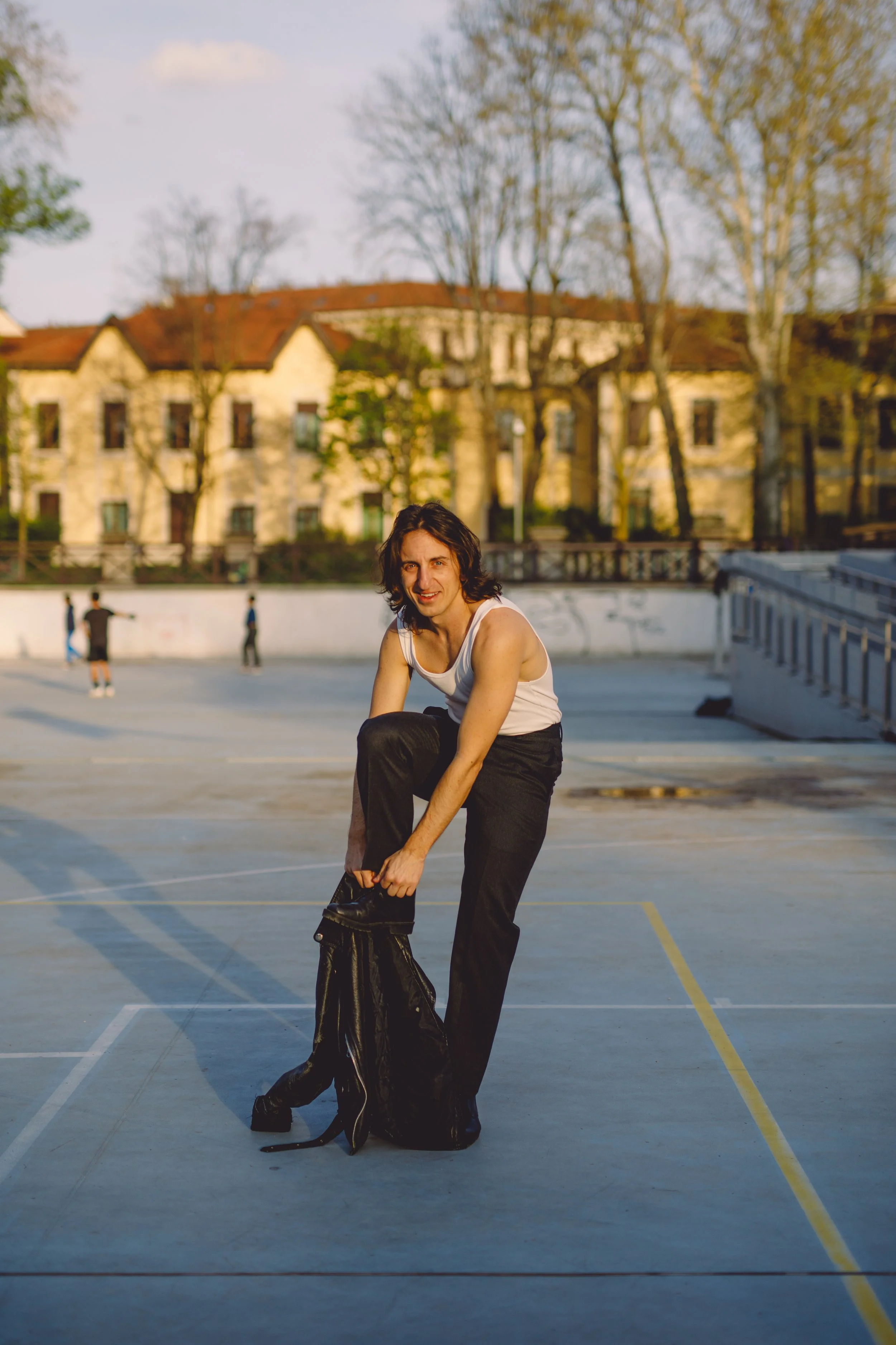 Un uomo con capelli lunghi in pantaloni neri e maglietta bianca si sta togliendo gli stivali in una pista di pattinaggio all'aperto, con bambini che pattinano sullo sfondo e alberi e edifici in lontananza.